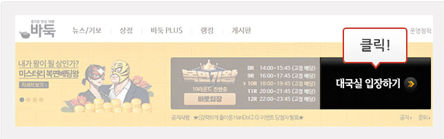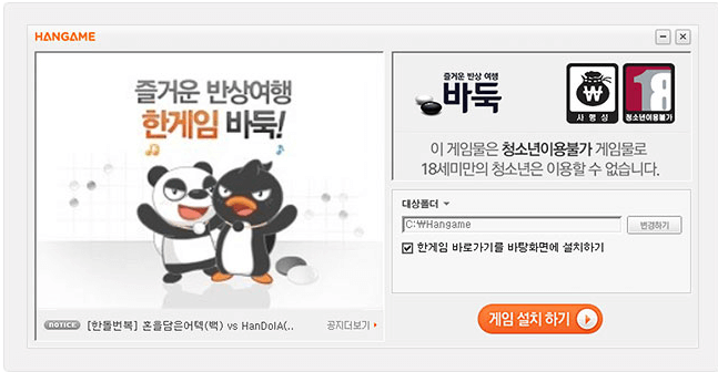 한게임 바둑 홈페이지 baduk.hangame.com 접속 후 회원가입 및 로그인을 진행합니다. 그후 대국실 입장하기를 클릭하면 한게임 설치가 진행됩니다.
