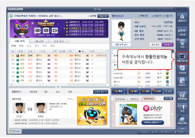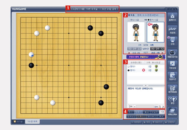 한게임 바둑은 프로들의 대결도 볼 수 있습니다. 프로들의 바둑경기를 보며, 다른사람들과 대화도 하고 바둑을 배울 수도 있습니다.