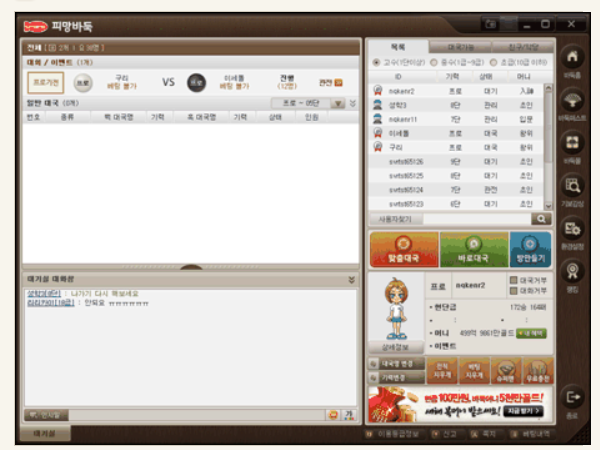 오른쪽의 유저 리스트 목록에서 대결을 원하는 상대를 찾아 대국신청을 진행합니다.