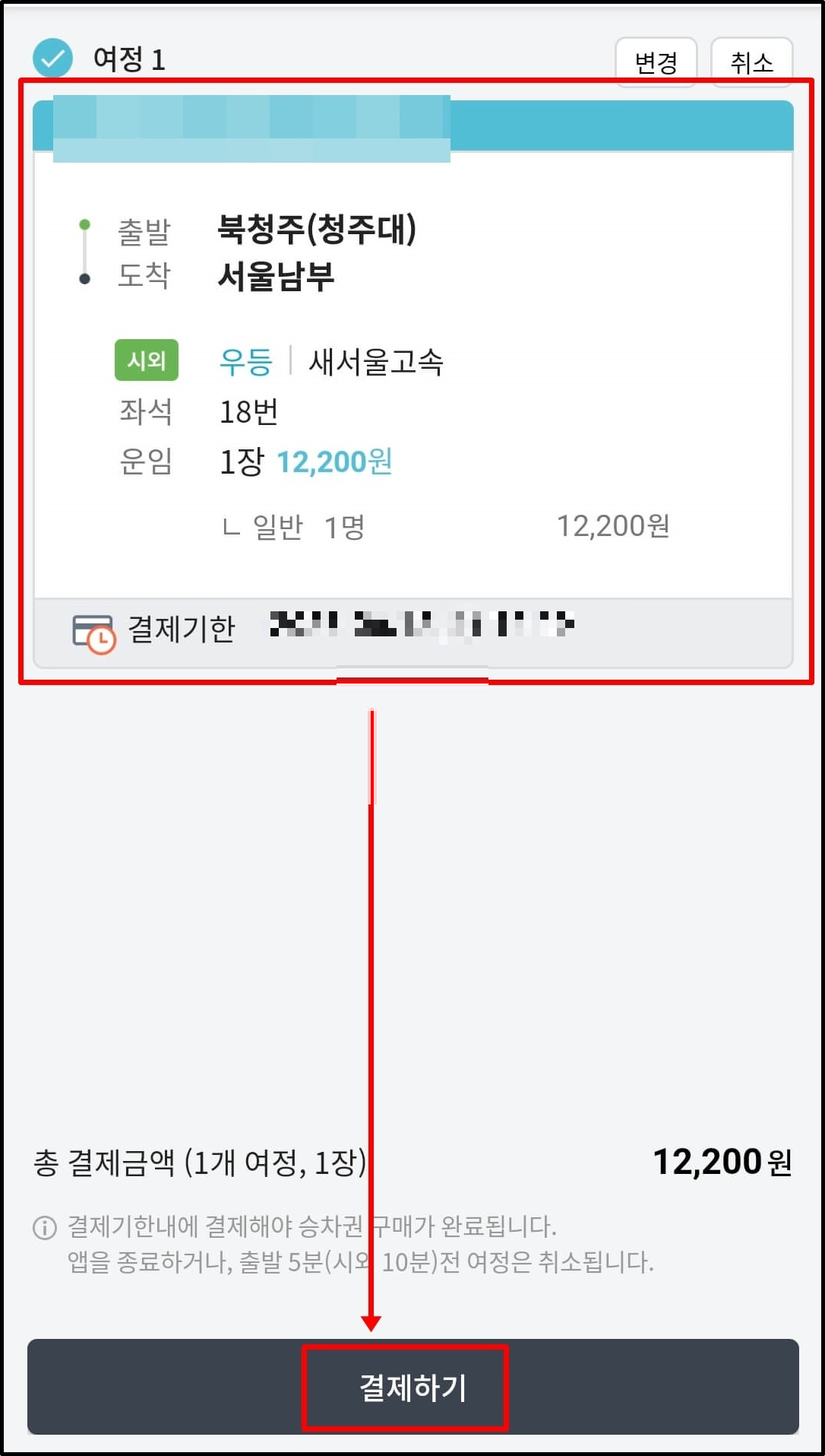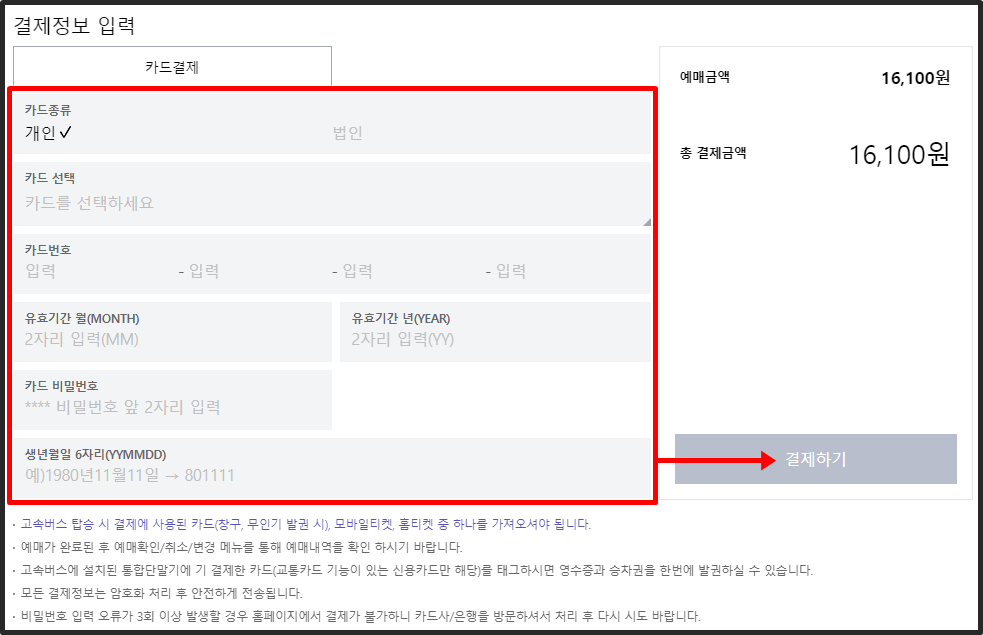 8. 카드결제를 위한 개인카드 정보입력 후 결제하기를 클릭합니다. 터미널에는 결제한 카드를 가져가 버스표를 무인기 또는 창구에서 출력하시면 됩니다.