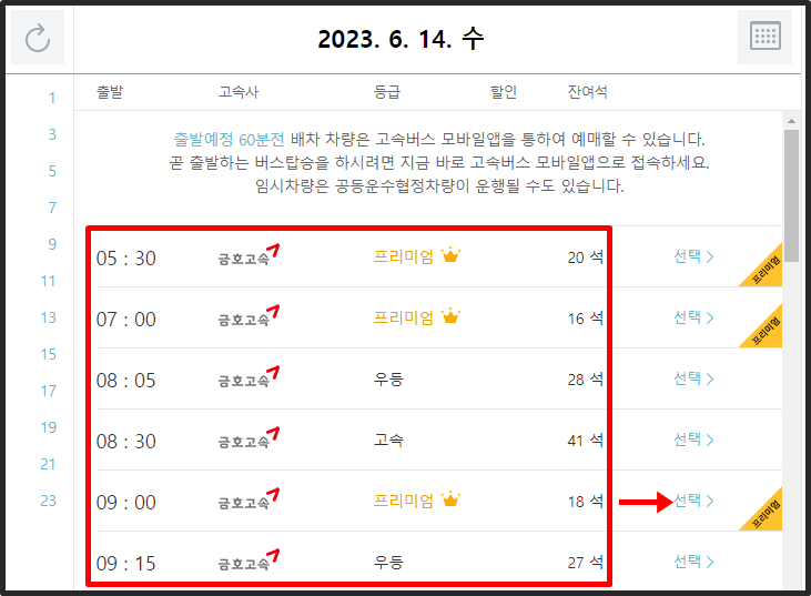 4. 원하는 시간간의 고속버스를 선택합니다.