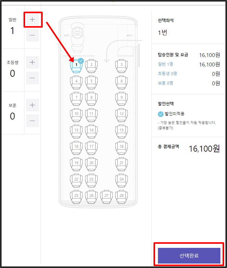 5. +버튼을 통해 탑승인원을 선택 후 탁승 자리를 선택합니다.