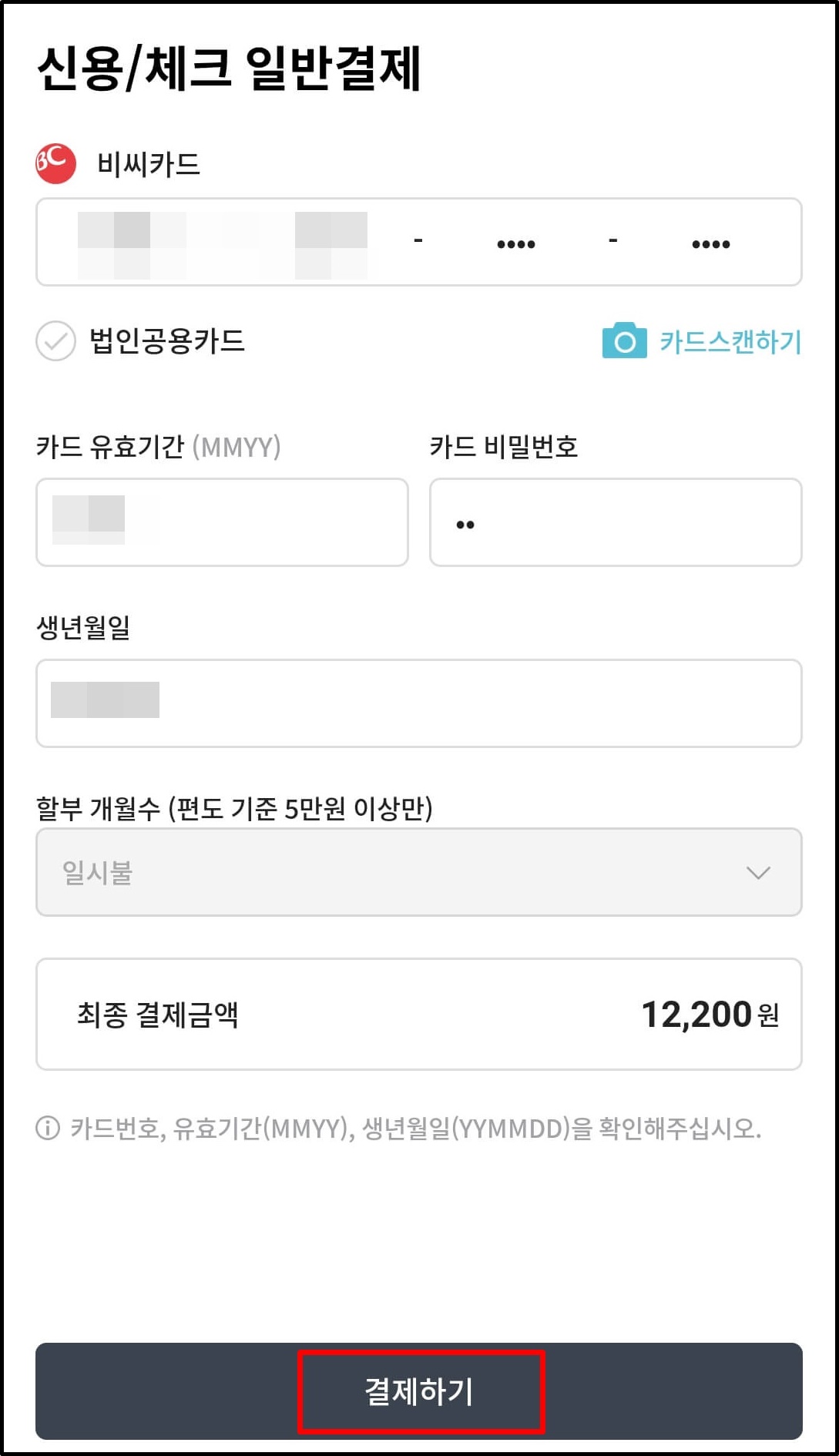 10. 신용/ 체크 일반결제 등 본인이 원하는 결제방법을 선택합니다.