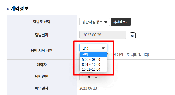 5. 탐방시간과 탐방 인원을 선택합니다. 탐방시간은 5시~8시/8시~10시/10~13 중 선택가능하며 탐방인원은 최대 4인까지 선택이 가능합니다.