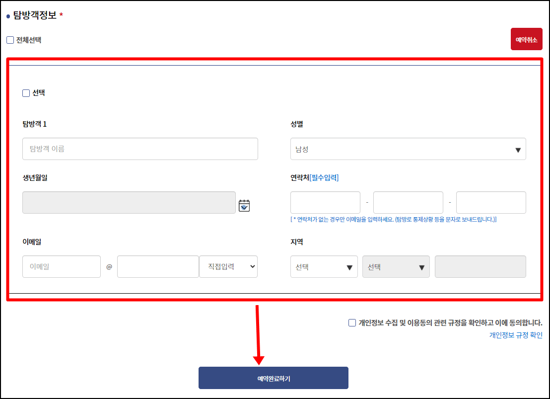 7. 예약 상세정보를 확인 후 탐방객정보를 반드시 입력합니다.